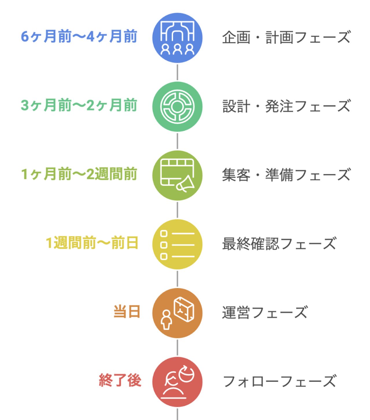| 1週間前〜前日 | 最終確認フェーズ | 搬入準備、備品チェック、スタッフブリーフィング |